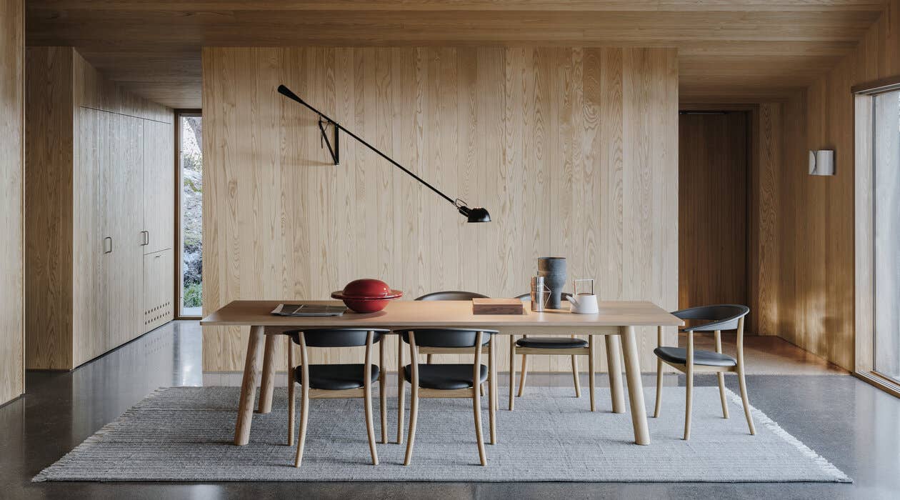 バックレストは2種類の選択がありフレームと同じオーク材による、ライトオーク、グレーオーク、ブラックオークそしてスモークオークから選ぶもの、そして特殊な製法により実現した座面と同じレザー張りのタイプです。