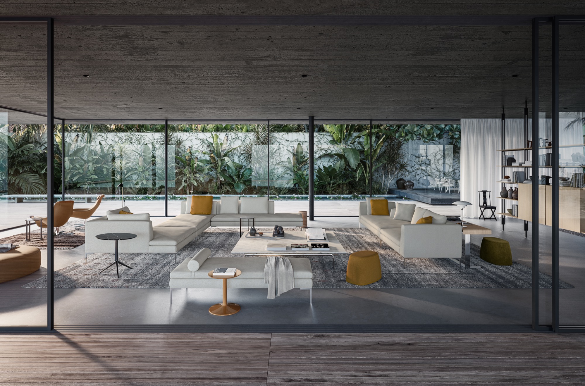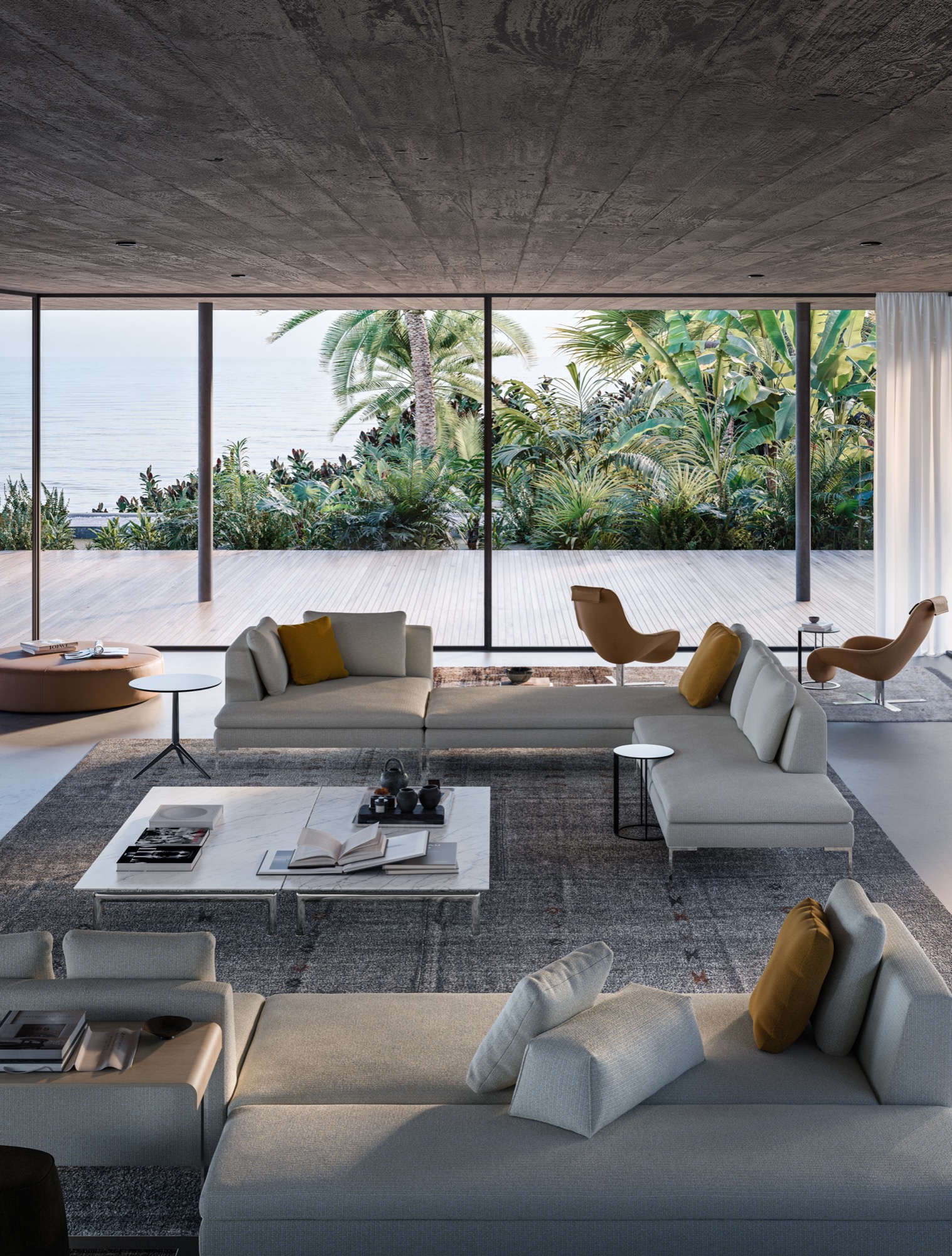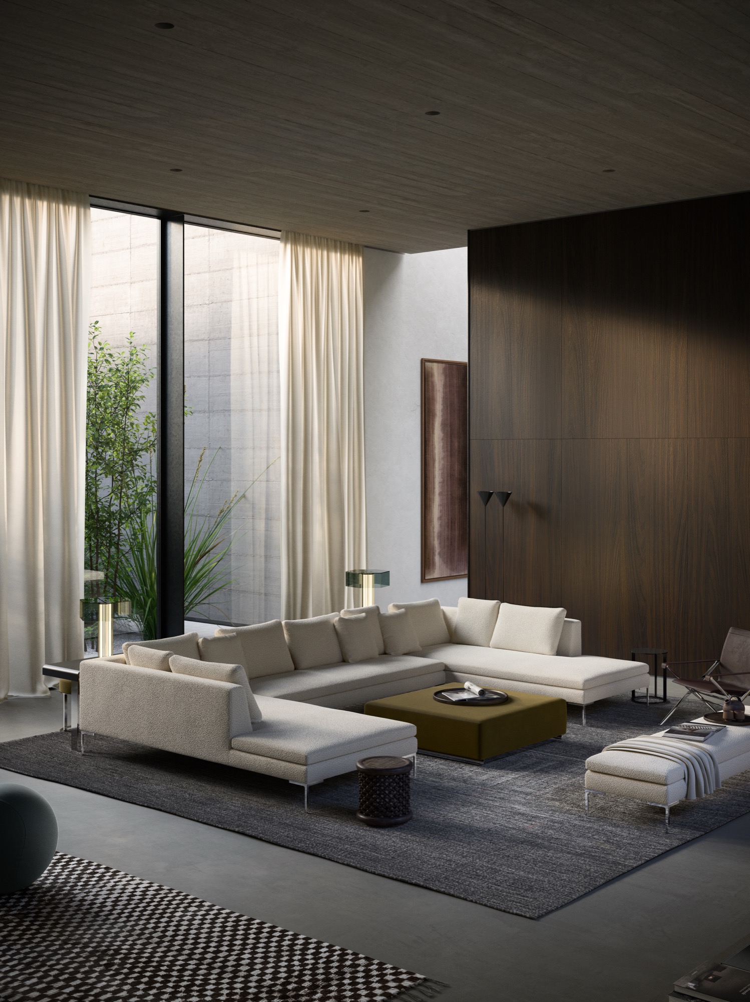 Charles<チャールズ>は、様々なタイプのエレメントを組み合わせることにより、たくさんのコンポジションを作り出すことができます。直線的なユニットやコーナーユニット、またはシェーズ・ロングエレメントをご利用いただけば、お部屋の真ん中に置くのに最適な抜け感を演出していただけます。シングルシート・クッションやバッククッションのアレンジも楽しんで。ブライトブラッシュ仕上げ、ブロンズ色のニッケル塗装またはブラッククローム仕上げが施された脚部は、その飾り気のないデザインが軽快なイメージを演出しています。より奥行きの深いチャールズ・ラージの広い座面に寝そべって身を任せれば、極上の心地よさを実感できるでしょう。