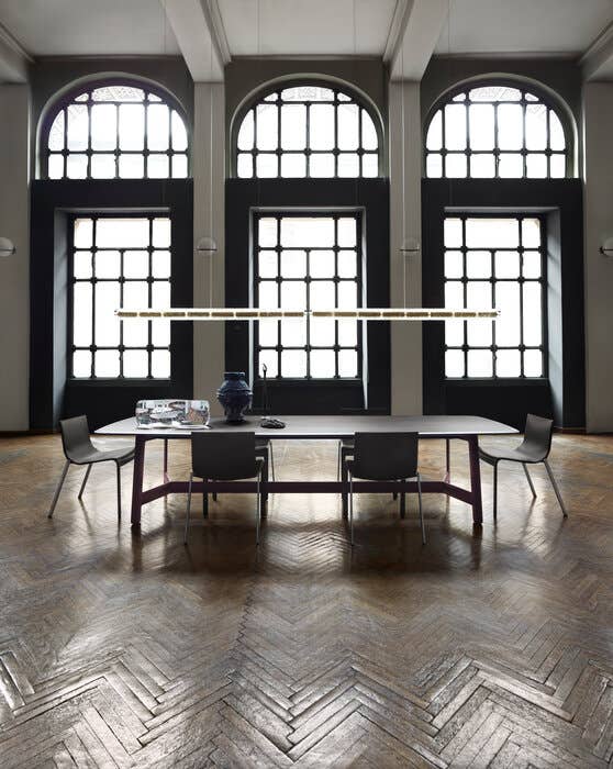 厚手のスムースレザーまたはエンボスレザーを使用し、前脚をカバーすることで、邪魔にならない統一感のあるデザインに仕上げています。後脚はブライトクロムメッキまたはブラッククロームメッキ仕上げ。ミーナの特徴は、洗練されたデザインと素材を持つチェアとしては珍しく、スタッキングが可能な点にも表れています。リッソーニは、使用後に簡単に収納できるような構造を考え、プライベート用でもコントラクト用にも新しい選択肢を提供しています。