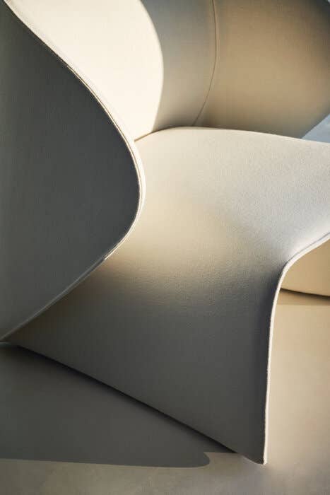 <Narinari (ナリナリ)>は非常にユニークな形状を持つスモールアームチェアで、その独創性と革新性で目を引きます。このチェアは、プロジェクトを手掛けた若きデザイナーたちの才能を体現しており、B&B Italiaとの初めてのコラボレーションの成果です。ファッションデザイナーとしての経験を持つティツィアーノ・グアルディーニと、様々な建築およびデザインスタジオとのコラボレーションで知られるルイジ・チュッフレーダが手掛けました。Narinariは、未加工のフェルトで張られており、細部に至るまで丁寧に仕上げられています。そのデザインは、折り紙のように折りたたまれたシルエットを思わせるもので、表裏の両面が追いかけ合うように連続した形状を形成し、柔らかくもしっかりとしたボリュームを確保しています。このデザインは、有機的な要素とデジタル的な要素の融合を象徴しており、古典的な要素と未来的な要素が交錯する現代の強い矛盾を反映しています。その結果、NarinariはB&B Italiaのコレクションにおいて、非常に個性的で独特な存在感を持つアームチェアとして仕上がっています。