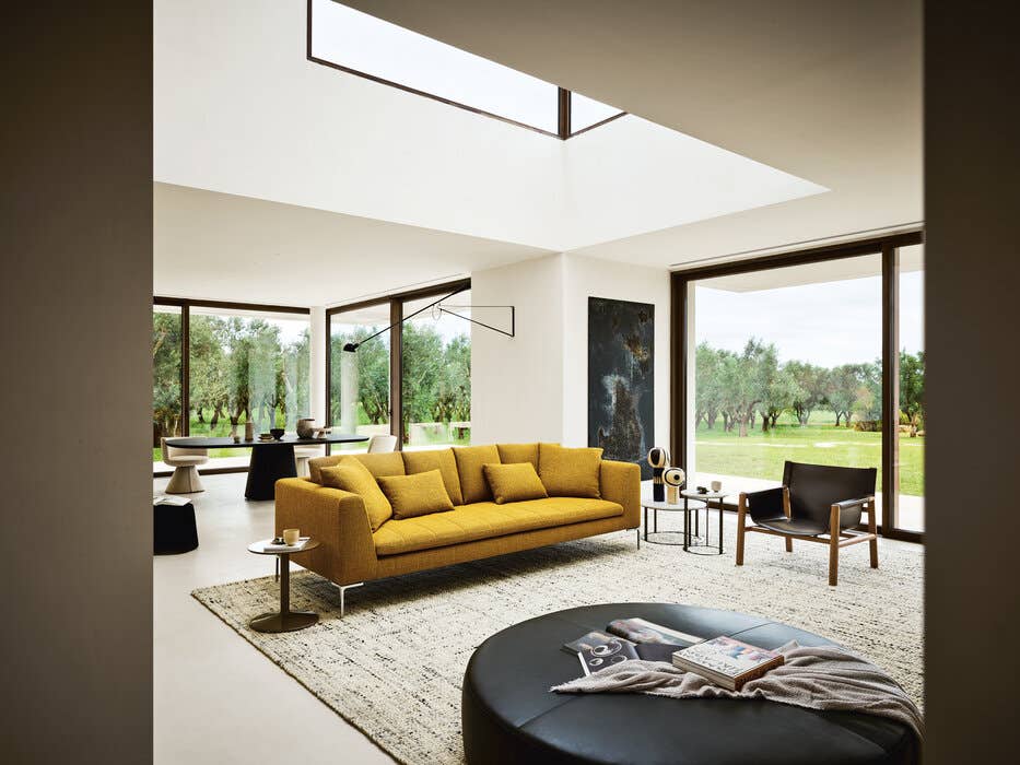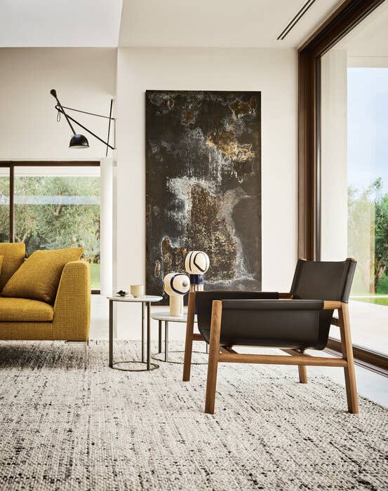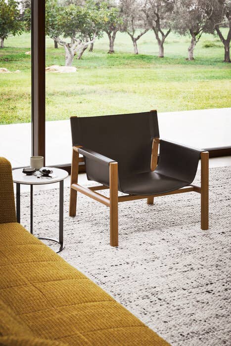 Pabloの特徴は座った時の心地良さと、座る人をしっかり支える頑丈さ。その2つの特徴により、美しく衝撃に強い構造を実現しています。シートには2層のレザーが施され、見た目には分からないほど薄いパッディングを採用。それにもかかわらず、座り心地の良さは抜群です。思わず目をとめるフォルムはシートの深さとやや傾いたフロントが特徴です。ミリ単位まで計測することにより、Pabloは新たなプロポーションを提案。アームチェアとシェーズロングの中間に位置する革新的なチェアを実現しました。座る人の体を包み、抱き止めるような構造は、バックレストにフィットし、アームレストに挟まれる感覚が、まるで空を飛んでいるような気分を演出します。デザイナーの細部へのこだわりは、お客さまに愛される優れた製品には多くの努力と細やかな心配りが必要であるというB&B Italia研究開発センターのコンセプトです。その姿勢は、直線と曲線が連続する印象的なデザインのほか、木の軽さ、切りっぱなしのレザーの力強さ、そして構造部の直線的なフォルムとそれを少し和らげてくれる滑らかな曲線部分が織りなす物語の中にはっきりと表現されています。まるで吊り橋や魔法の絨毯のよう。安らぎを与えてくれるこのアイテムは、ビジュアルは斬新でありながら、エレガントで快適。絶妙なバランスを実現しています。