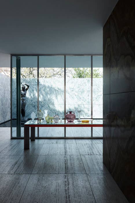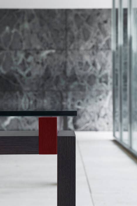マイケル・アナスタシアデスが、B&B Italia のために初めてデザインしたテーブルのコンセプトは、2本の印象的なアルミニウムの梁材が両側で結合され支えられているというものです。基本の構造は、極めてミニマルで本質的な考え方に基づいていて、コンセプトがそのまま実体化したようなものです。究極のシンプリシティを追い求めていくと、時に最先端の技術的な解決法を見つけ出さなければならず、Parallel Structure<パラレル ストラクチャ>は、まさにその完璧な例となっています。このプロジェクトの純粋さに着目するなら、純粋な形状の構造部材と異なる素材の組み合わせによる接合部のクリーンな関係性に多大なる配慮がされていることです。脚部は、無垢の木材で作られていますが、サイドサポートは、電解着色されたアルミニウムのアーキトレーブ(梁状)に接合されて金属のコアを隠すようにソリッドさを与えて、構造の視覚的な軽さを実現しています。コレクションは、2つのサイズと異なる素材が天板に用意されています。カナレット・ウォールナットとライトオーク、グレーオーク、ブラックオーク、そしてスモークドオークの4種類のオークのバリエーションです。さらにミニマルで美的なチョイスとして好評なガラスの天板が用意されていて、よりエンジニアリング的な美しさが透過性のある素材によってより強調されることになります。このテーブルは、明快な単純さで余分な要素を全て消し去ることで、純粋でモノリシックな存在を創り出しているのです。名前の由来であるParallel Structure<パラレル ストラクチャ>は、デザインの世界に建築的なアプローチを自然な形で持ち込んだものなのです。