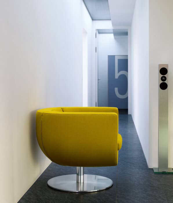 チューリップは360度回転し、フレキシブルにお使いいただけるアームチェアです。チェアの高さは、エレメントの厚みと、直線とカーブの接点とのバラン スをうまく取っています。ブライトブラッシュ加工を施した丸いアルミニウムベースにシェルの一部が映る姿は、その丸みを帯びたフォルムを効果的に演出 しています。背もたれの2本の切れ込みと柔らかいシートクッションにより、快適な座り心地が生み出されています。