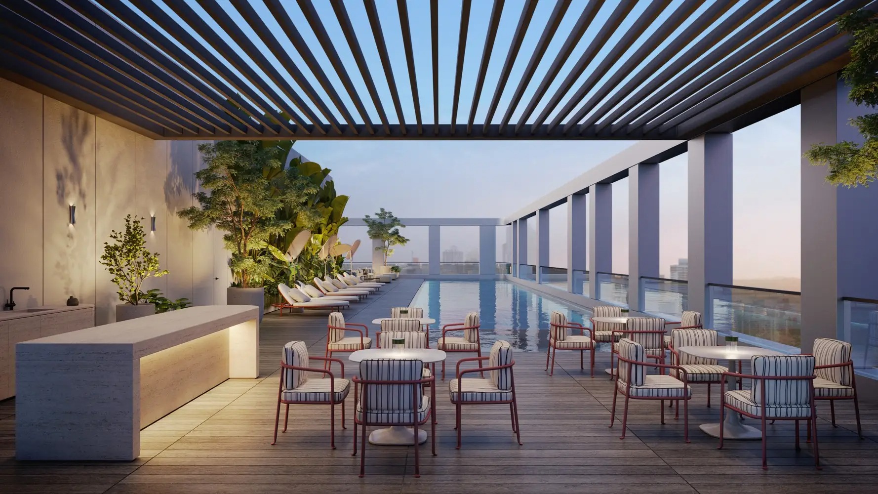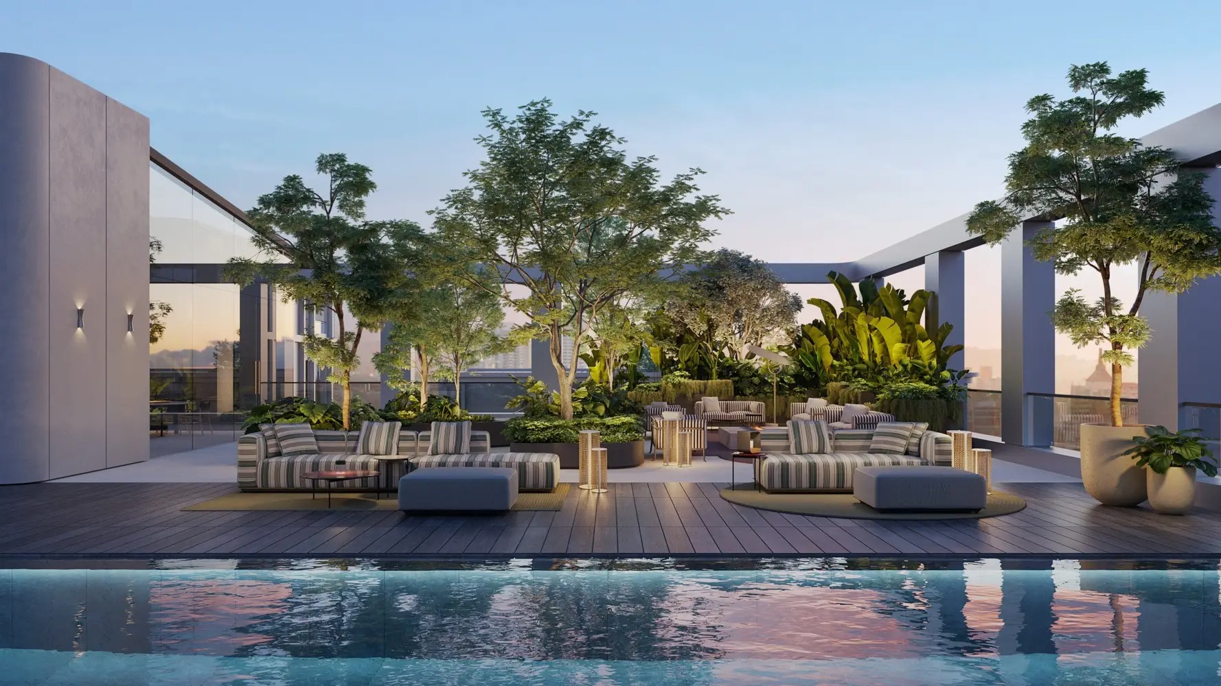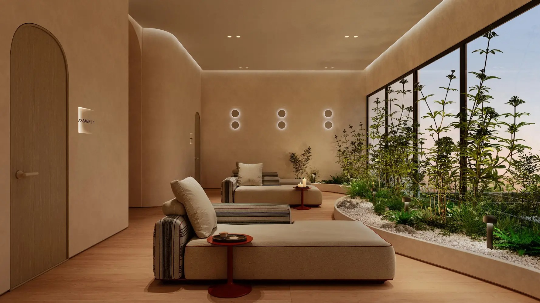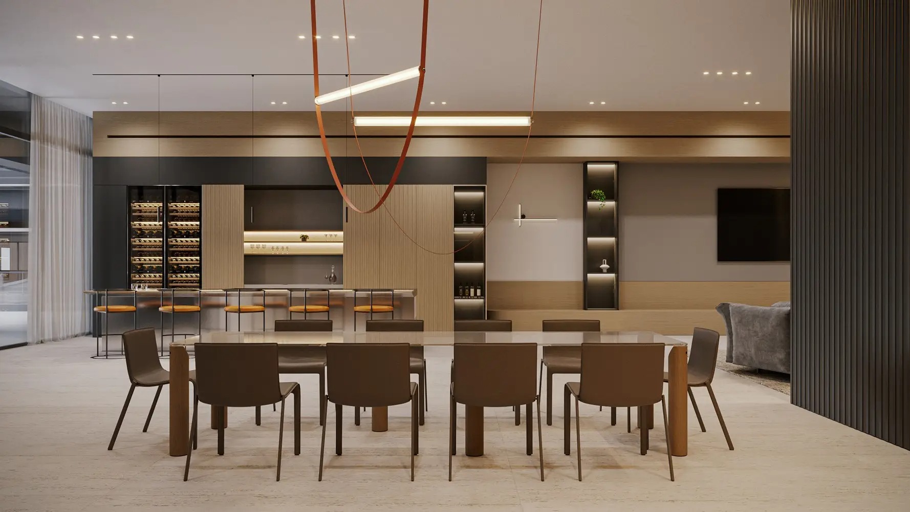 建築、ランドスケープ、インテリアが流れるように呼応しあう、モダンで統一感のある空間体験を特徴としています。